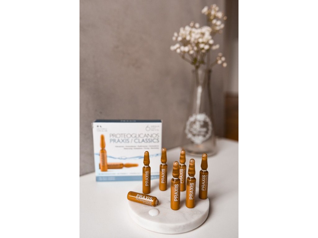 Praxis Ampule CLASSICS, Proteoglicanos CLASSICS 6 amp 4 + 1 balení zdarma dodávají záři, hydratují a obnovují pokožku. Působí již od prvního použití a mají dvojí působení. Okamžité zpevnění a rozjasnění pleti.